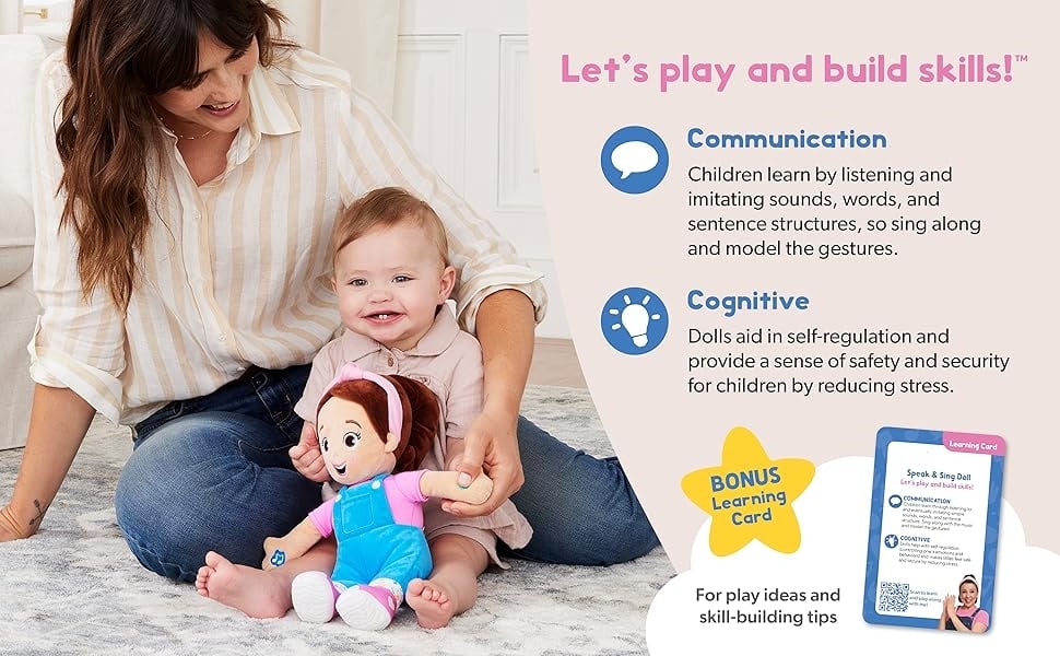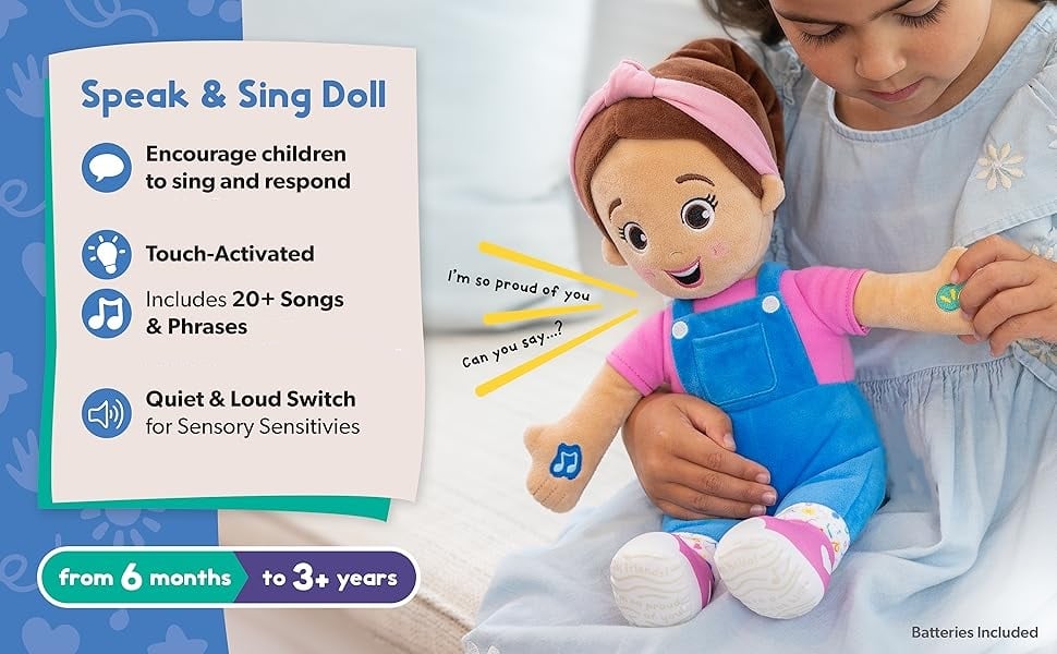 Interactive Fun: Our Doll responds to hugs and touches by singing songs and sharing phrases, offering a fun and interactive experience. Plush toy more than just a toy, this Speak & Sing Doll emotional and development. Children learn through play, absorbing valuable life lessons and language skills as they sing, dance, and interact with their new friend. The doll encourages imagination, empathy, and a love for music and expression.